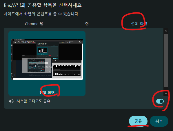 이것을 누르면 팝업이 하나 더 뜨는데, 다음과 같이 전체 화면 탭에서 전체 화면을 고르고, 시스템 오디오도 공유를 켜준 후 공유를 누르면 바로 비주얼라이저가 표시된다.